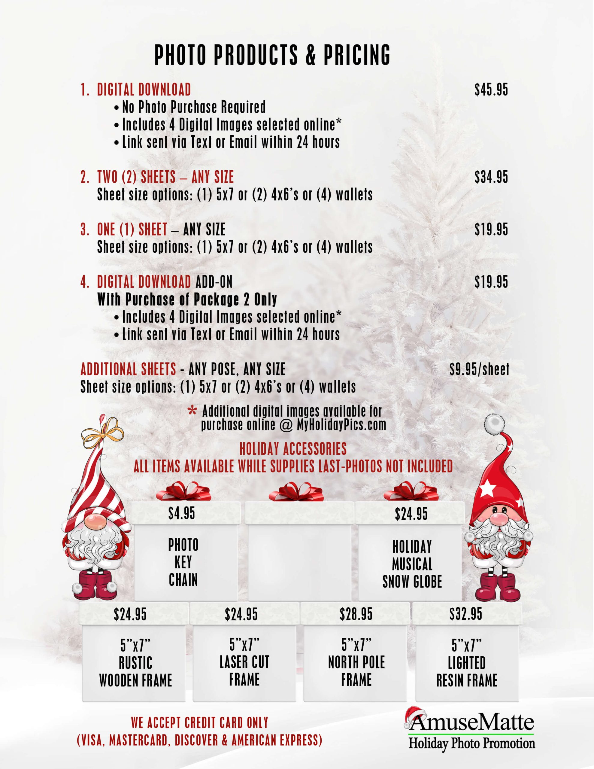 A $20 deposit is required at time of booking. Your deposit includes your visit with Santa and a $20 credit towards your purchase of photos and/or digital download.