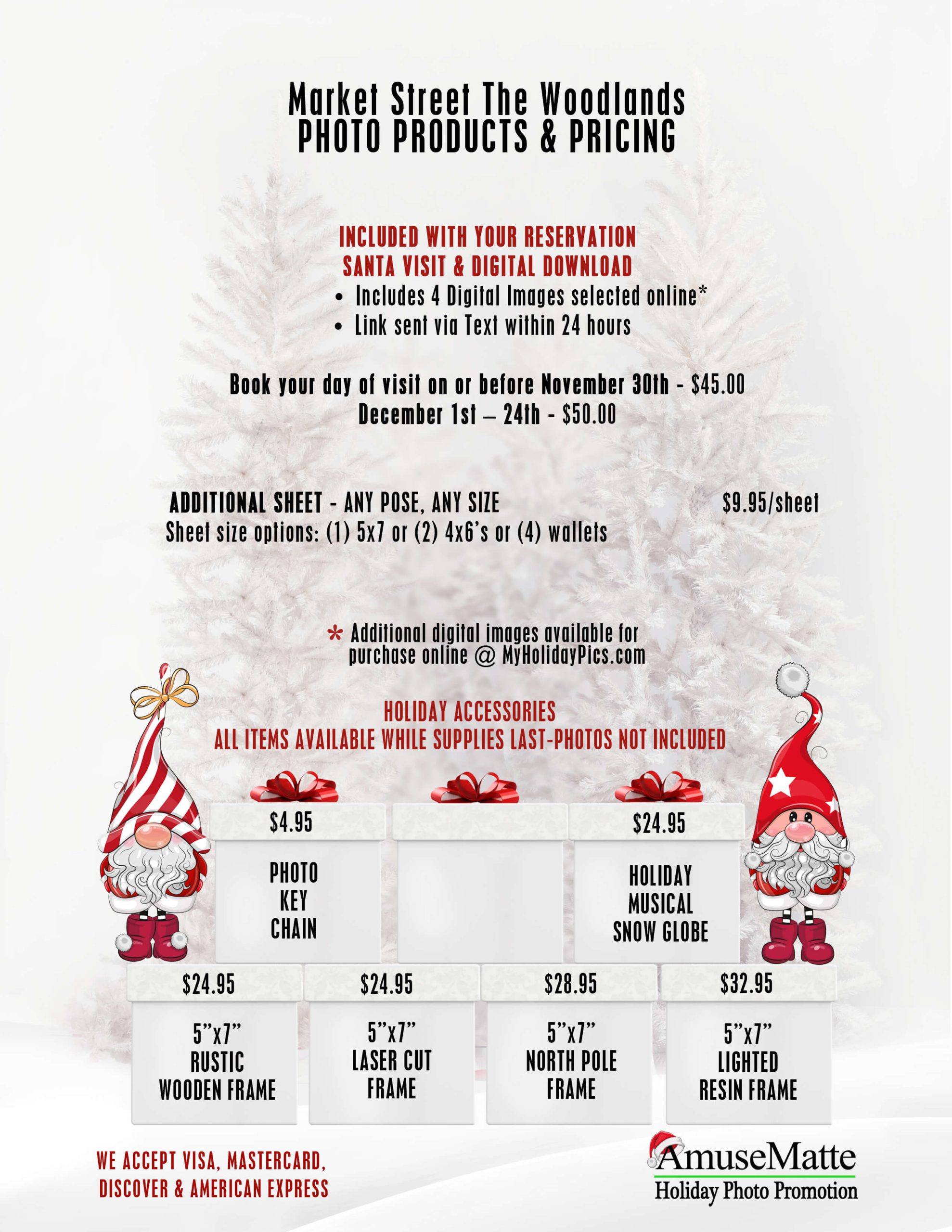 Included with your reservation is your visit with Santa and a digital download of your images (sent via text).