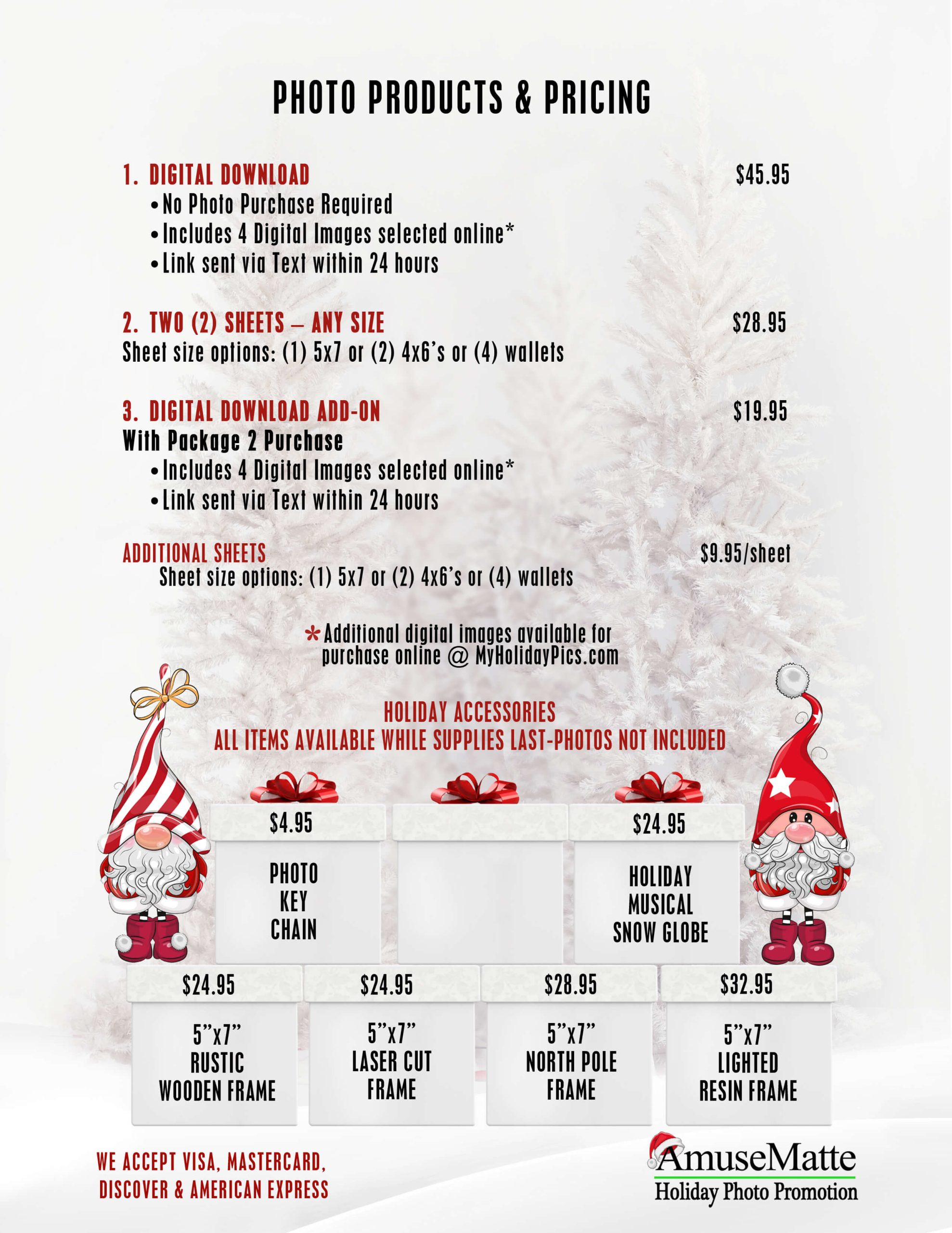 A $20 deposit is required at time of booking.  Your deposit includes your visit with Santa and a $20 credit towards your purchase of photos and/or digital download.